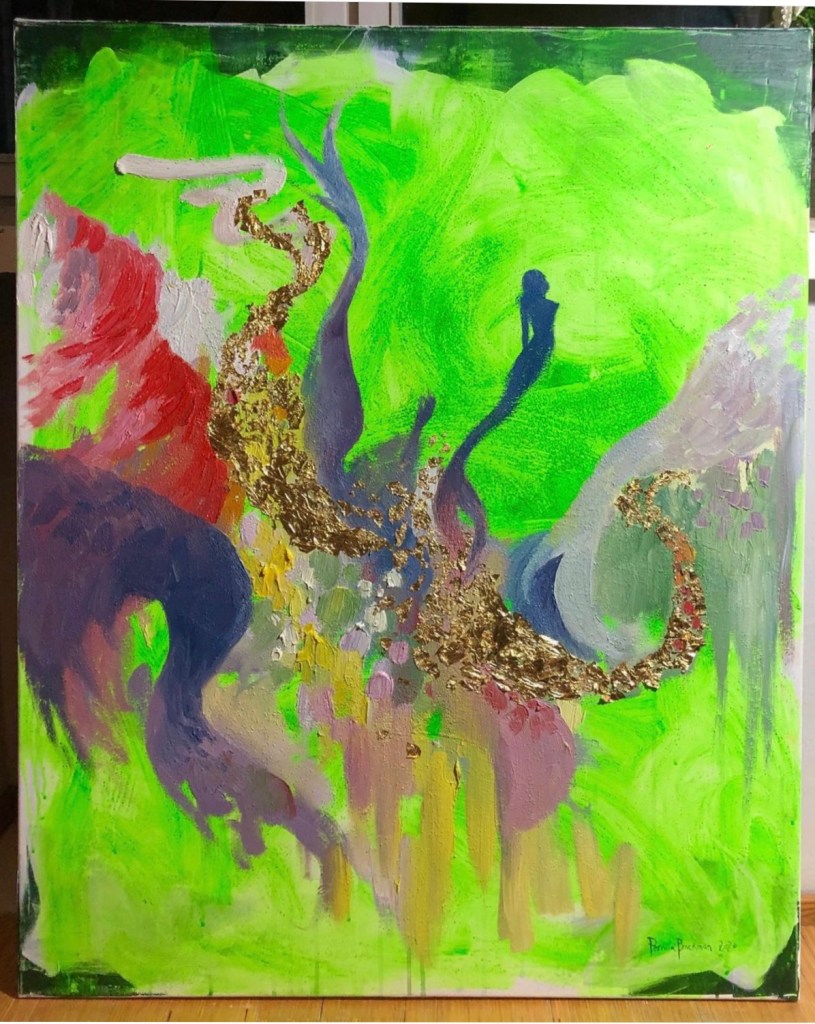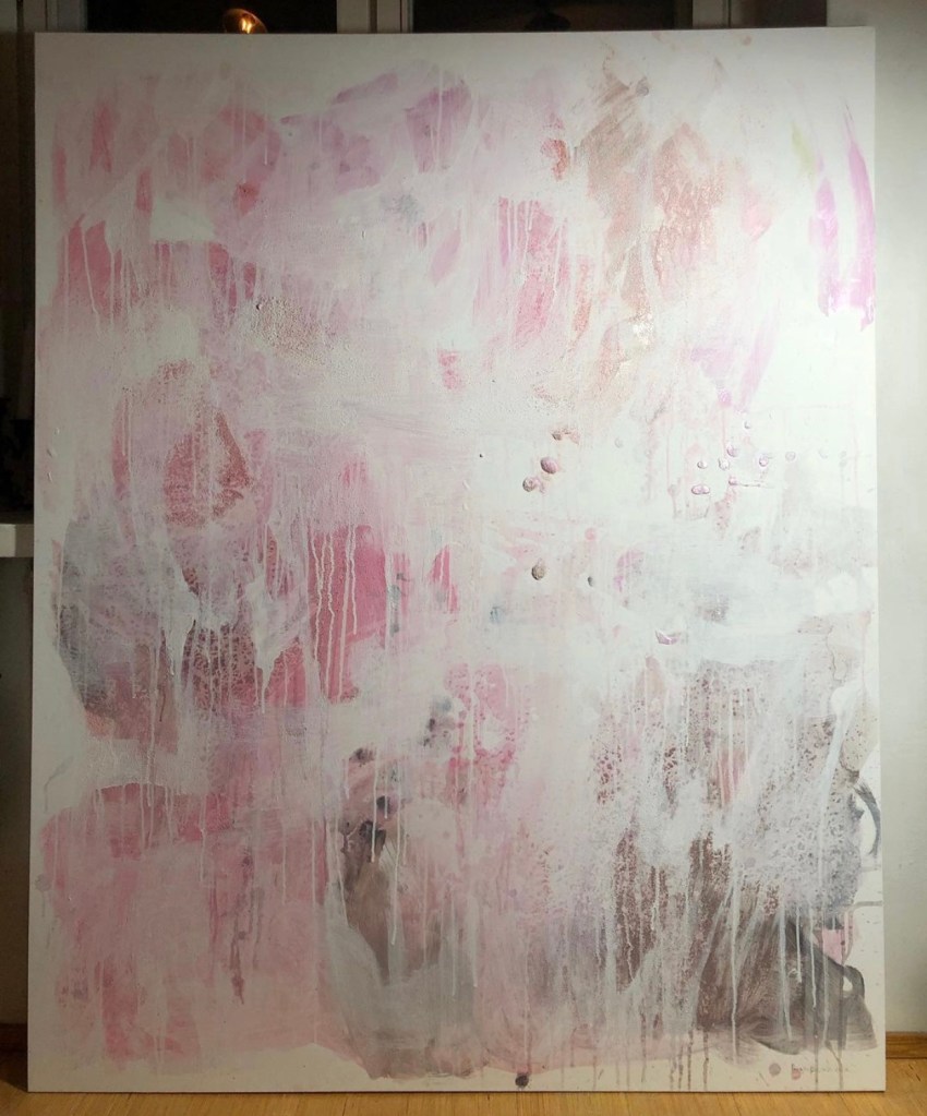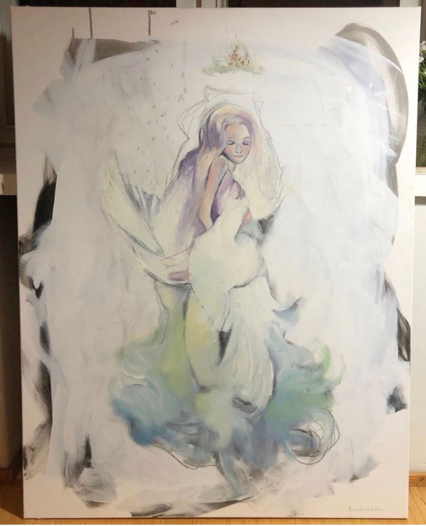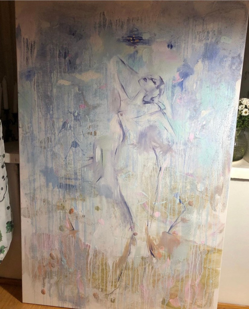 One of her strengths as an artist is the ability to beautifully mix realistic and abstract art, but also using different kinds of materials to create texture and layers. Her continous play with style and color adds a richness and depth to her interpretation of an idea or a feeling. She has a very curious and intuitive approach to creating and she channels a lot of emotion into her paintings.