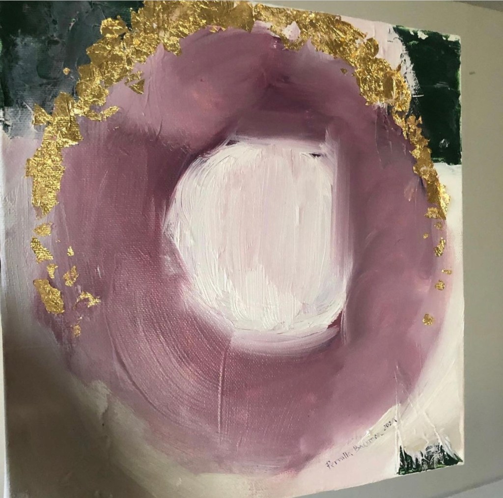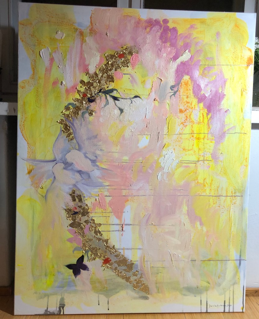 “Jumalatar”, 100x150cm, oil, acrylic and gold foil on canvas, 2020, *sold“Gnossiennes”, 120x150cm, acrylic on canvas, 2020, *sold“Spirit”, 100x100cm, oil and acrylic on canvas, 2020, *sold“Bulletproof”, 30x30cm, oil on canvas + gold foil, *sold“Roar”, 89x116cm, oil on canvas + gold foil, 2020, *sold“Halo, Ø130cm, oil + gold foil on canvas, 2020, *sold“Tears getting sober”, 89x116cm, oil and gold foil on canvas, 2020, *available“Out of the woods”, 89x116cm, oil on canvas, 2020, *soldTry a little tenderness”, 80x100cm, oil and gold foil on canvas, 2020, *sold“Surrender”, 100x150cm, acrylic on canvas, 2020, *available“Look what you made me do”, 89x116cm, oil on canvas, 2020, *sold“Freedom”, 89x116cm, oil and gold foil on canvas, 2020, *soldDesert Rose”, Ø130cm, oil on canvas, 2020, *soldRépondez-moi”, 81x100cm, oil and gold foil on canvas, 2020, *available“Dawn”, 120x150cm, acrylic on canvas, 2020, *sold“Ikävä kotiin”, 21x30cm, ink and gold foil on paper, 2020, *sold“Carry me in your dreams”, 80x100cm, oil on canvas, 2020, *soldView from the exhibition at Roasberg.“Gnossiennes”, 120x150cm, acrylic on canvas, 2020, *soldView from the exhibition at Roasberg.From the opening night, Pernilla (in the middle) with her friends. Picture: Jonna Hirvonen.