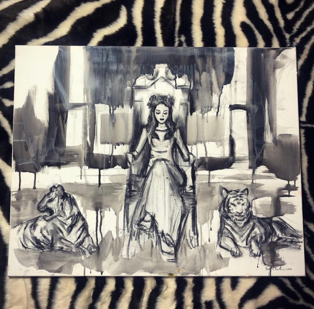 She mostly uses oil paint to showcase the vision of her inner world, but she does enjoy trying new materials- like drawing with charcoal and applying goldleaf to her paintings.
