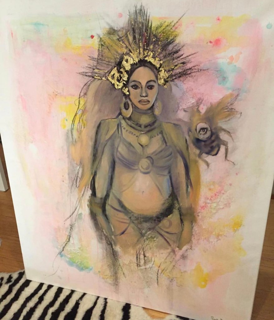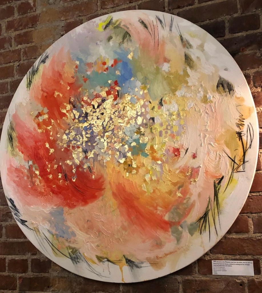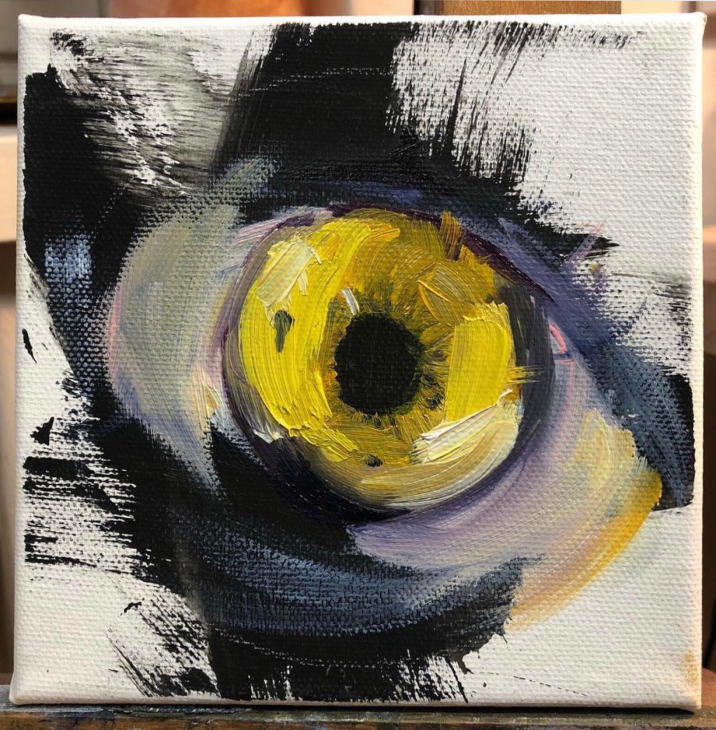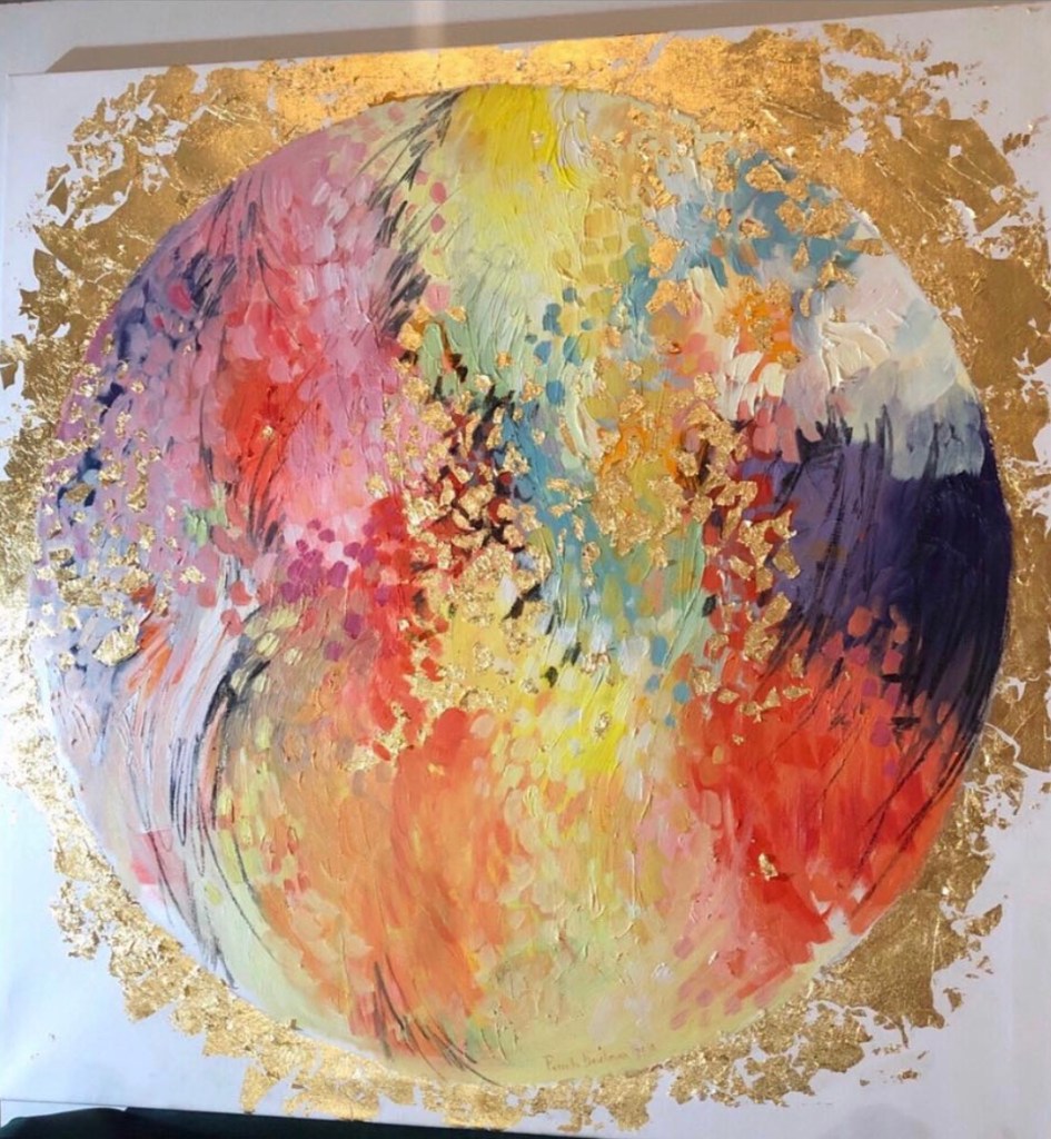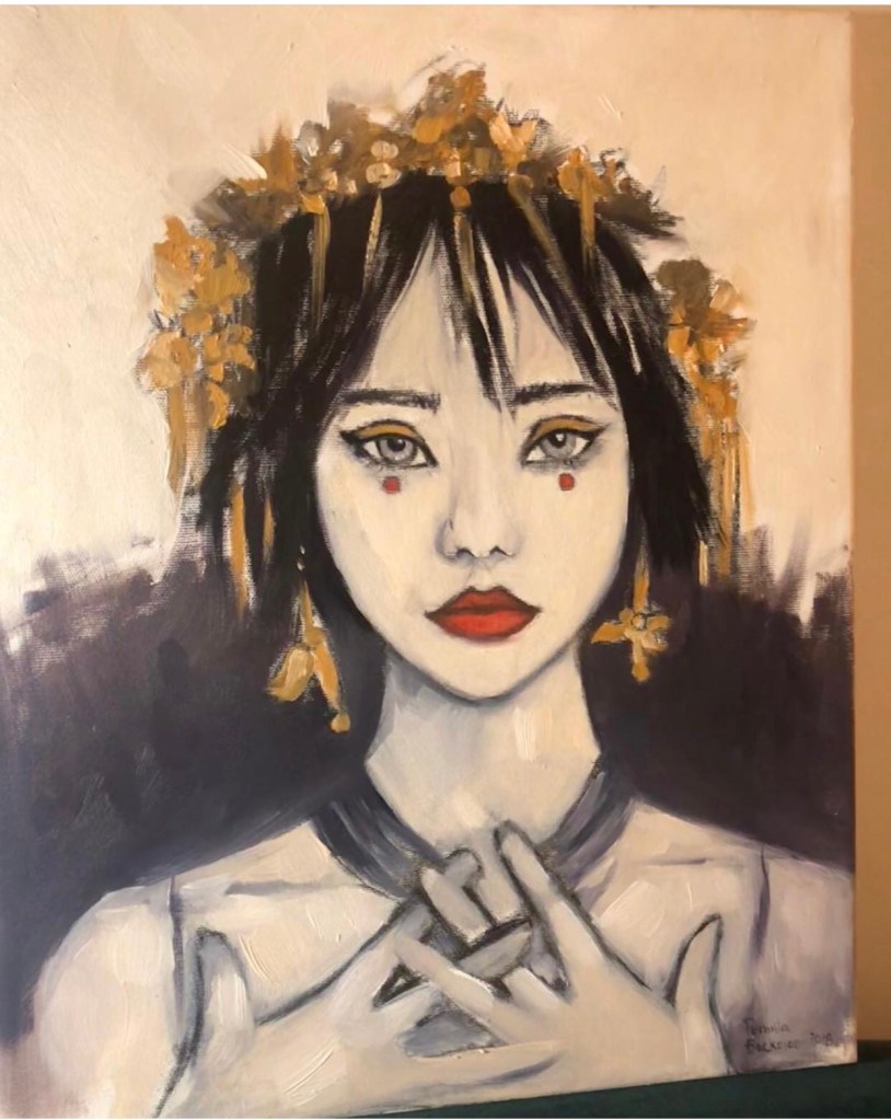 She mostly uses oil paint to showcase the vision of her inner world, but she does enjoy trying new materials- like drawing with charcoal and applying goldleaf to her paintings.